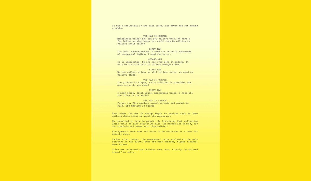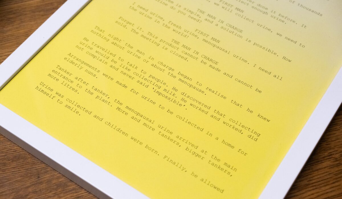 In the late 1950’s retired nuns in an Italian convent were asked by the Vatican to donate their urine to a fertility company, which was part owned by the then Pope’s nephew. From this urine, the company extracted a hormone to inject into infertile women. Gallons of urine were collected. Morgan’s screen-printed work The Discovery of Nuns’ Urine (2022) features an edited excerpt from a screenplay written by an employee of the drug company about their discovery of the power of nun’s urine.