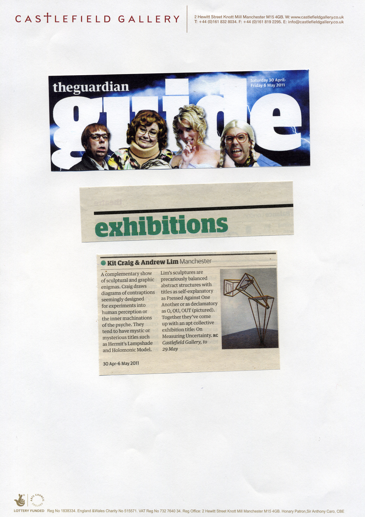 Castlefield Gallery is pleased to present On Measuring Uncertainty, a two person show with Kit Craig and Andrew Lim. Their works reference, and are in part reliant on the laws of physics and mathematics, combining both a sense of geometry and natural form. The works that attempt to interpret and convey the unimaginable use references that range from early computer programmers flow charts, a 16th Century hermits dwelling to a cryptic interpretation of Rembrandts Self Portrait with Two Circles. Both through the use of traditional gallery display vernacular or materials and tools that are indigenous to the gallery space, the artists decipher or rearticulate our understanding of these disparate references.
