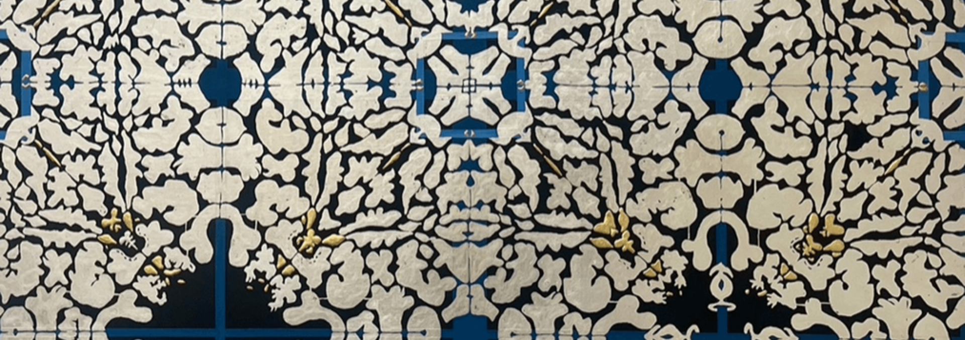 AFTERGLOW presents a series of paintings that explore the nuances of pattern and the reflective surface. It marks the first time Halliwell has worked with silver leaf on such a large scale. She notes that what she enjoys about using new materials is their capacity to surprise. For instance, she hadn’t anticipated that under the artificial lighting of the shopping centre, the silver leaf’s highly reflective quality would flatten; absorbing the surrounding light, it can appear almost white and matte instead of metallic. In contrast, when natural winter sunshine filters through the roof lights, the surface responds dramatically – the gilded silver leaf reflects the light, heightening its luminosity and disrupting the geometry. Each of the three larger panels floats slightly away from the wall. They have been back-painted, and closer inspection reveals a subtle halo of colour cast onto the surrounding space. The combination of gilded surfaces and projected light creates a quiet interplay between the surface and the wall, evoking ideas of aura and memory. Over time, the silver leaf will slowly tarnish, deepening in tone – an ongoing, visible transformation that speaks to time, change, and the question of when a work is ever truly finished.