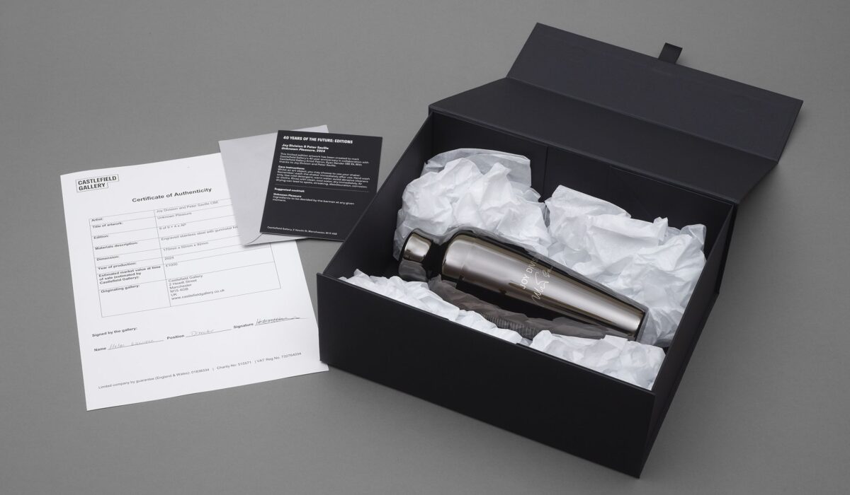 40 Years of the Future: Editions are a limited series of beautifully engraved cocktail shakers, created with a group of celebrated, award-winning artists, who at the invitation of Ryan Gander have donated their designs in support of Castlefield Gallery.
