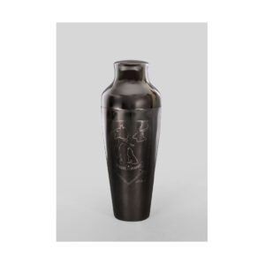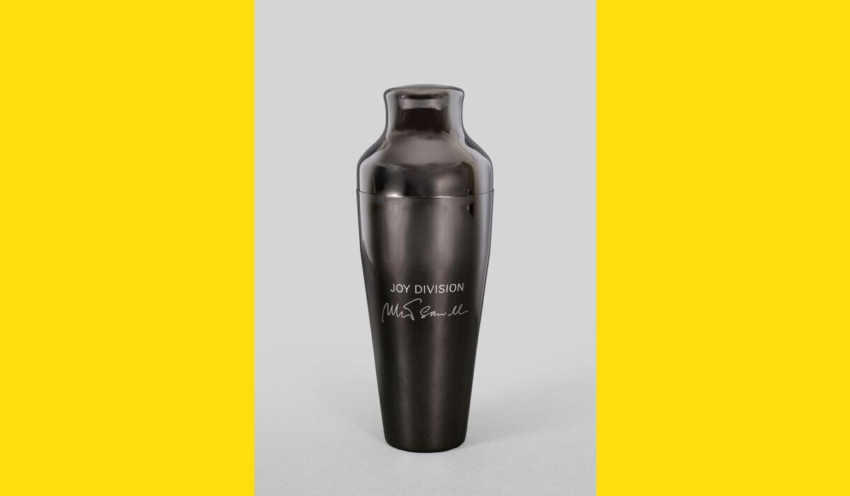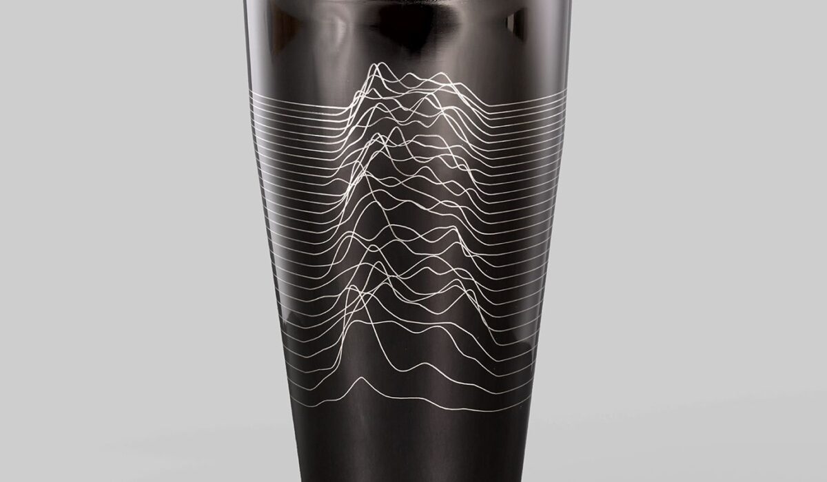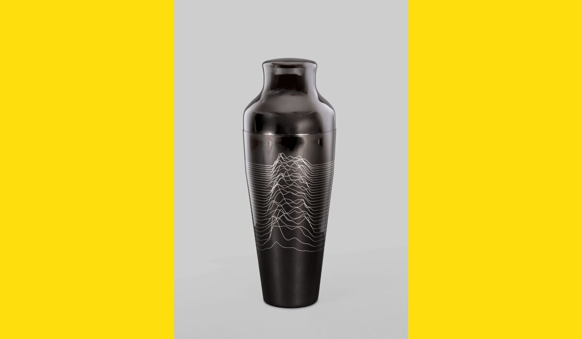 This cocktail shaker has been engraved with a version of the iconic album cover artwork designed by Peter Saville for Joy Division’s Unknown Pleasures released by Factory Records in 1979. The design is taken from a visualisation of data from a pulsar (a highly magnetised rotating neutron star) published in the Cambridge Encyclopaedia of Astronomy, which Joy Division guitarist Bernard Sumner came across in Manchester Central Library.