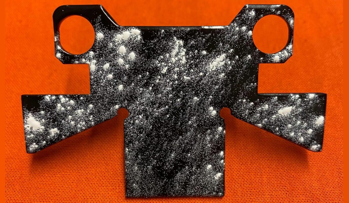 These pieces of Industrial Jewellery are made from unbent hinge housings which have been powder coated by Ellis at Ritherdon & Co Ltd (est. 1895), a manufacturer of specialist steel enclosures in Darwen, Lancashire.